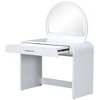 Designed to elevate your daily beauty routine, this modern vanity table blends elegance, safety, and versatility in one refined piece. Softly curved edges and a stylish wavy drawer front create a sophisticated look while reducing sharp corners for added safety. The spacious drawer keeps cosmetics, jewelry, and essentials neatly organized and within reach. An LED-lit mirror with touch control offers three adjustable lighting modes, ensuring flawless makeup in any environment. With the mirror removed, the vanity easily transforms into a functional writing desk, making it ideal for compact spaces. Crafted from durable, smooth materials, it delivers lasting comfort, stability, and timeless style.
