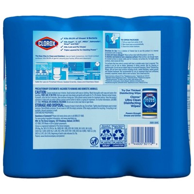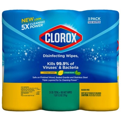 DISINFECTING WIPES: Clorox Disinfecting Wipes are triple-layered to clean, disinfect, deodorize and remove allergens for 5x Cleaning and leave a pleasant scent.ALL-PURPOSE WIPE: These all-purpose disposable wipes remove common allergens, germs and messes on surfaces like kitchen counters, bathroom surfaces and more.MULTI-SURFACE CLEANER: Wipes are safe for finished wood, sealed granite and stainless steel and on non-food-contact surfaces in the home, office, classroom, pet area, dorm and locker room.DISPOSABLE WIPES: This three-pack of 35-count canisters that easily dispenses disposable antibacterial wipes that come in three fresh, clean scents. Dispose of wipes according to manufacturer instructions.NO BLEACH: Disinfect and deodorize with Clorox Disinfecting Wipes for a bleach-free, all-in-one cleaning alternative that’s safe to use on toys and more.