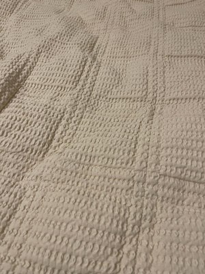[This review was collected as part of a promotion.] This is a great quilt first it is soft, and lightweight without being too heavy or uncomfortable. The color is beautiful, and the waffle material is gorgeous. This is a traditional queen size, and fits on the bed nicely. I was able to wash this before use, and it cleaned beautifully. I would highly recommend this product, and I would rebuy also bedding from this brand.