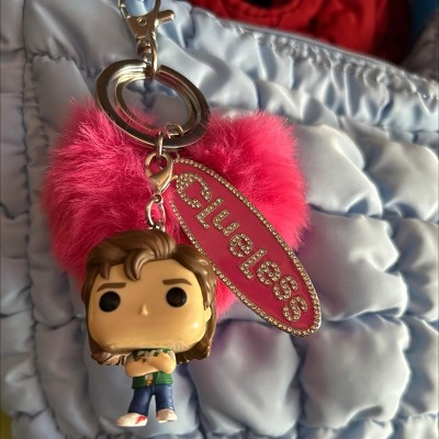 Indulge your inner Cher Horowitz with this Clueless keychain, featuring a chic metal charm of the movie's iconic logo and a heart-shaped pom for added flair. Crafted from premium zinc alloy, rhinestones, and polyester materials with an enamel fill, this keychain exudes high-quality craftsmanship. Equipped with a lobster claw clasp, it's easy to attach to your keys or bag for a touch of '90s nostalgia wherever you go. Keep it looking fresh with simple wipe-clean care.