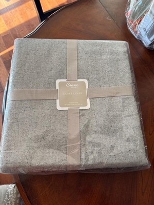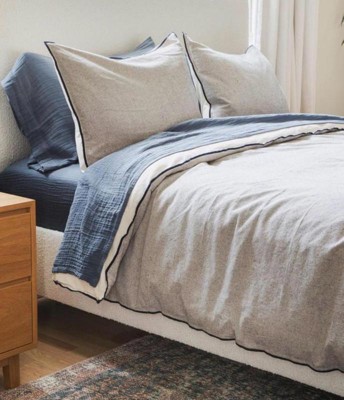 The Oasis Collection captures the tranquility of coastal escapes, blending cool tones and soft textures. This cover features a heathered blue on one side and a soft sandy neutral on the other, finished with a clean hidden button closure for a streamlined look. The deep navy thick stitch border adds to the simple but elevated design. Layer this light gray duvet cover with the matching Oasis Sheet Set and pillow shams to create a refreshing, sea-inspired sanctuary. OEKO-TEX® Standard 100 certified.