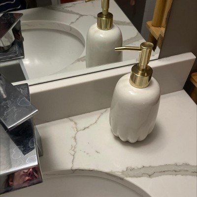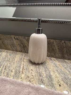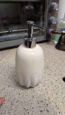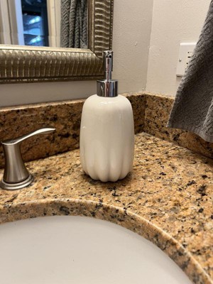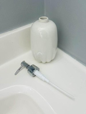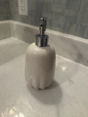 I love the look of this soap pump. The white color paired with the silver lid gives a clean modern feel. The scalloped-like bottom adds to the style of the soap pump. This pump looks great in my guest bathroom. I was pleasantly surprised with the size of the pump, much bigger than I had expected. The pump is ceramic and high quality. Filling it with soap was easy and the pump works effortlessly every time. If any soap gets spilled on the pump it is super essay to clean off. If you are looking for a soap pump that works great and adds style to your bathroom, I highly recommend this one by Threshold.