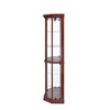 - Warm, medium brown finish adorns this transitional corner curio cabinet