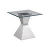 Elevate your living space with this contemporary coffee table set, featuring tempered glass tops and polished stainless steel hourglass-inspired bases. The coffee table boasts a rectangular top, while the end table offers a square top, both with beveled edges for added refinement. Clear glass surfaces highlight the sculptural curves and geometric design of the bases. Designed for modern interiors, this set combines sleek artistry with practical functionality.