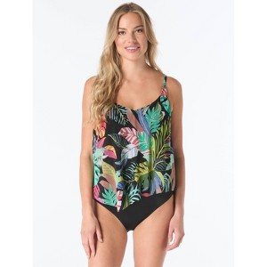An easy, breezy, mesh overlay graces a swimwear top for a timeless tankini option. Pair it with a bikini bottom or denim shorts and slide sandals. A colorful jungle print gives a wild vibe to your sunshine style.