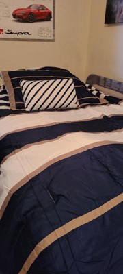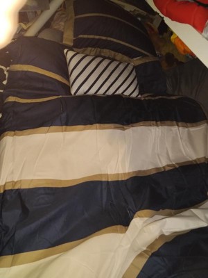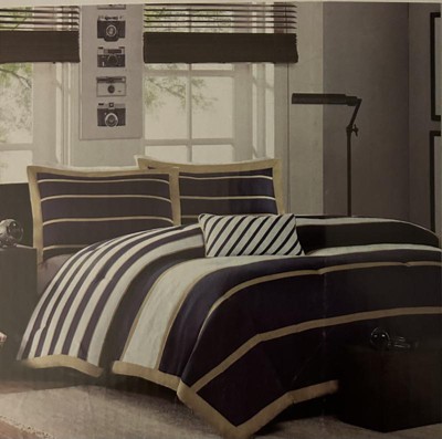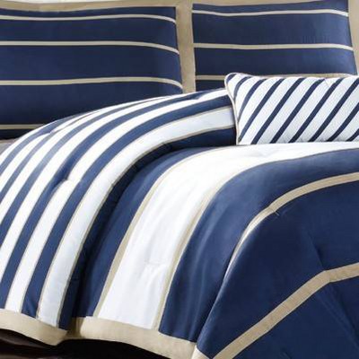 [This review was collected as part of a promotion.] The Mi Zone Ashton Comforter set is unique in style and design, with an unusual combination of navy, white and khaki stripes, I've personally never saw this color combination used together, but it works beautifully together with it's large white and navy stripes accented by khaki, comes with a white accent pillow with navy stripes, this pattern would be great in a masculine decor,our in a room where guess will be staying, I love it's bold appearance, it's machine washable, treated with antimicrobial for built in freshness, it reduces odor, less odor, less washing insuring many years of use of this beautiful comforter set, I love this set.