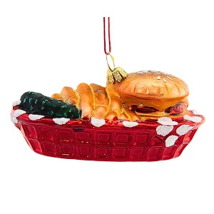 - Add a touch of whimsy to your holiday decor with our "Burger Basket" ornament. Made of delicate glass and equipped with a hanging cord, this unique decoration will make your tree stand out (pun intended) from the rest. Perfect for foodies and burger lovers alike.