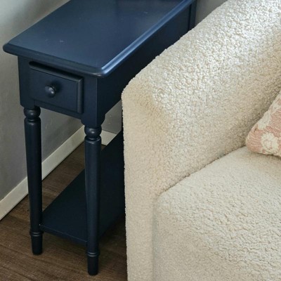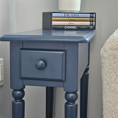 I love colorful pieces of furniture and this is a lovely colorful side table. The color is a deep, rich navy blue that has a hint of a sheen to it, not glossy but not completely matte. It is narrow so it would be great for placing beside a recliner or at the end of a couch, especially if you have limited space. I needed a table in my bedroom as I have very limited space and this table was the perfect choice. I placed it right next to my bed like a nightstand and it fits perfectly in that tiny little space that I had available. It was very carefully packaged so all pieces were in perfect condition when I received it, no chips, no scratches, no scuffs at all. The paint coverage is totally even and very smooth. The pieces are made of actual solid wood, not pressed fiberboard. Assembly was super easy, it only took about 10 minutes, and no tools were needed except for the Allen wrench that was provided with the hardware set for this table. The table is sturdy and balanced, no rocking side to side. The drawer is very small, it's big enough for a TV remote control or 2, something about that size. It has a shelf at the bottom for more storage space. I am extremely happy with this table, I really do recommend it.