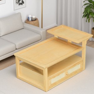 This coffee table combines rustic charm with modern functionality. Its durable rattan drawer adds a natural touch while offering convenient storage, and the dual tabletops with an additional shelf provide generous space for daily use. Crafted from high-quality MDF and natural wood, the table¡¯s elegant design and nested configuration enhance both style and practicality, making it a versatile centerpiece for any living room. Easy to assemble with minimal effort.