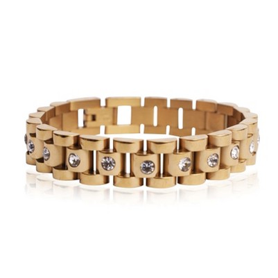 Our Coleen Bracelet has a statement-worthy watch link, featuring repeating hinge links sparkling with round cut stones nestled inside. Elevate any stacked bracelet look with our brightly polished watch bracelet for a modern yet classic style. A smooth interior lends comfort to this chunky bracelet.