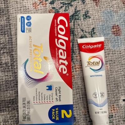 - Includes two (2) 5.1 oz tubes of Colgate Total Active Prevention Whitening Toothpaste
