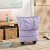 [This review was collected as part of a promotion.] I am loving this collapsible rolling tote bag. It can easily fold up so you can pack as an extra bag to have (for souvenirs). The wheels easily go and come off for storage. The color options are great - I chose the bright pink bag so I can easily find it. It actually holds quite a bit and has a slot on the side so you can attach it to your luggage.