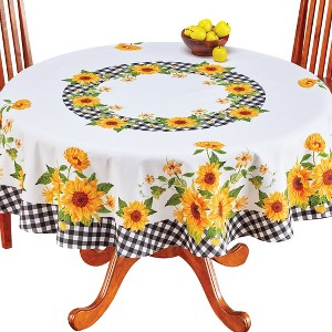 This Delightful Tablecloth Is Printed With Cheerful Sunflowers. Available In Two Sizes, The Bright Flowers Are Showcased Against A White Background And The Design Is Finished With A Black & White Plaid Border. Machine Wash. Polyester; Imported. Choose: Round (69 1/4"Dia.) Or Rectangle (91"L X 61"W).