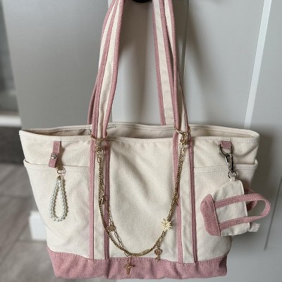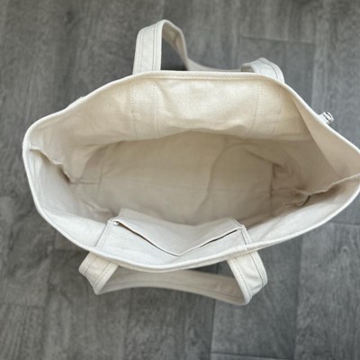 I love this canvas bag for summer. I bought the neutral color and plan on adding fun bag charms it has two pockets on the side which fit a water bottle great and one pocket inside will be using this all summer long.