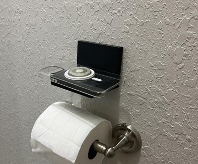 Perfect phone holder for the bathroom. The shelf is plastic! Idk what I was expecting it to be but it wasn’t this lightweight plastic.