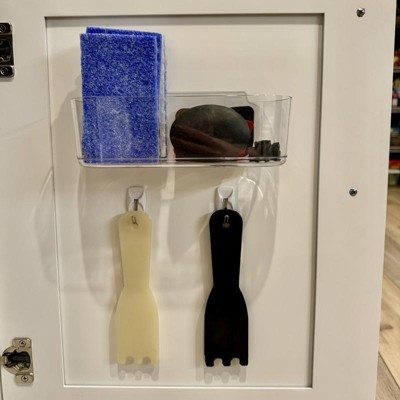 The caddy is appreciated for its clear design and versatility, making it useful for organizing small items in various locations like cabinets and RVs. However, many guests have experienced issues with the adhesive strips not holding up, leading to the caddy falling off shortly after installation. Some guests recommend using stronger strips for better adhesion.
