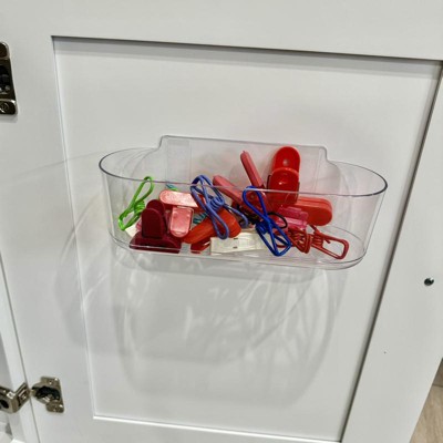 Purchased for inside the cabinet door. Unfortunately, this caddy comes with clear strips. I understand why as this is a clear container;however, as many of us command users know the clear strips can be sensitive to certain surfaces. So for all who is concerned about this product falling: if the clear strips it comes with doesn’t adhere to where you’re using it, use the traditional white size large strips or even use large bathroom refill strips. It’s a pain you have to buy a refill strip pack just to adhere this caddy but it’s worth having storage in cabinet.