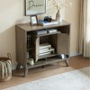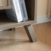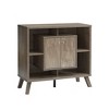 Compact display storage sideboard bookcase cabinet two door four open shelves metal knobs wooden flared legs