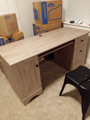 I have needed a new deal for a long time and when I saw this one, I fell in love with it and got it. It fits perfectly in my office space and I get compliments on the beauty of the desk all the time now. It is roomy and sturdy. Just wish the cord hole was a tiny bit bigger, but it works.
