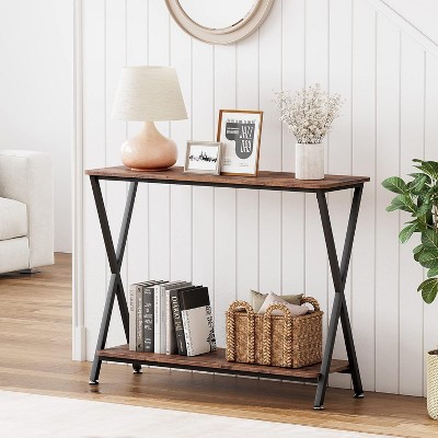 - √ EXTRA STORAGE SPACE: This rustic sofa table with open shelf is a versatile foyer table for your entryway. The bottom tier of the 2-tier sofa table provides an ideal spot for additional storage, whether it be for shoes, baskets, or anything else. By fully utilizing the available space, you'll have all your daily essentials easily within reach, ensuring a neat and tidy home or office. The long and skinny shape allows the industrial entryway table hidden behind the couch or under the window.