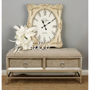 - •Contemporary storage bench with cushion carries a pale metallic gold finish with silver hardware and beige upholstered linen