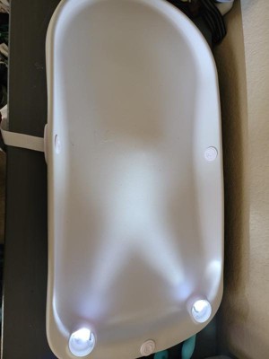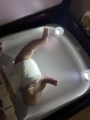 This is a super cool changing pad! The lights have 3 brightness settings that allow you to choose what’s best for your needs. What I like is the lights really are zoned into just the bum area. With twins it’s nice to be able to see what I’m doing to change a diaper without having a light that wakes sister up. I also like that I was able to attach it to my changing table with no issues. The material is firm and can be wiped down but not cold and has some give for comfort. The only negative is for the price I didn’t think there would be any imperfections but mine came with one on the bottom (see pic)