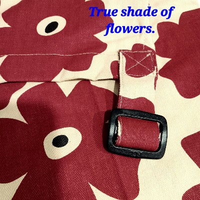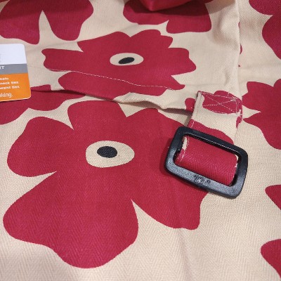 Nice adjustable neck strap for comfort. Apron is quite long which is nice if you're a messy cook. Fabric is fairly thick and heavy so will withstand use and laundering well. Giving 4 stars instead of 5 because the flowers are not poppy red as shown in the description or photo. They are a dark magenta pink. Cute but not poppy red like I was hoping.