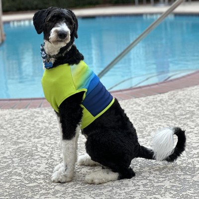 Whether it's time for a road trip or a daily walk, your pet will stay comfy cool in the Cooling Dog Vest from Sun Squad™. This pet vest features a two-tone look with a green and blue ombre-like pattern for an eye-catching look. Tailored with soft and stretchy fabric, this dog vest offers flexible comfort, and it comes with a zipper closure to keep it secure.