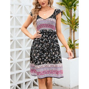 Coolmee Women's Summer Floral Dress V Neck Flutter Sleeve Bohemian Dress Casual Smocked Swing Mini Dress - 1 of 4