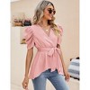 Coolmee Women's Tops Short Puff Sleeve V Neck Wrap Belted Ruffle Peplum Casual Blouse Tops