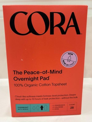Cora Organic Cotton Ultra Thin Overnight Fragrance Free Pads with Wings for Periods - Super Absorbency - 28ct