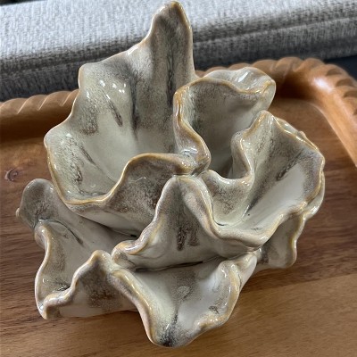 I like the organic look and color of this ceramic object. It is not very large, I have moved it to different locations, it is versatile.
