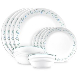Periwinkle-blue blossoms and hearts accent the rims on the Corelle 16pc Country Cottage dinnerware set, service for 4. The lacy vined plates coordinate with the striped bowls, creating gracious settings to enjoy every day. These versatile plates and bowls are easy to care for, going from microwave to table to dishwasher with ease. The extra-strong, triple-layer Vitrelle glass is lightweight, super durable and easy to care for, so you can enjoy worry-free use every day. The ultra-stackable design also makes for easy transport and ideal storage within any sized kitchen. Service for four includes: (4) 10.25" dinner plates, (4) 6.75" appetizer plates, (4) 18 oz soup/cereal bowls and (4) 10 oz dessert bowls.