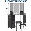 Lighted Mirror with 3 Modes: This corner vanity desk with mirror and lights features a 3-fold mirror with adjustable lighting—choose warm, day, or cool light modes to perfect your makeup for any occasion or time of day. Designed with a large desktop, two cabinets with shelf, two open side shelves, and a handy hanging storage bag, this makeup vanity desk offers ample space for all your cosmetics, beauty tools, and accessories. Equipped with built-in power outlets, this vanity makeup desk makes it easy to use and charge your devices, hair dryers, or beauty tools right at your dressing table—streamlining your beauty routine. Constructed from high-grade engineered wood, this bedroom vanity is both sturdy and durable for daily use. The smooth surface is easy to clean, ensuring your vanity makeup table always looks its best.Your corner vanity desk comes complete with a comfortable matching stool and a detailed instruction manual, making assembly simple and quick—bringing elegant functionality to any bedroom or dressing room.