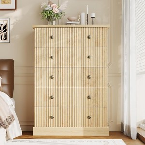 5-Drawer Tall Dresser, Vertical Chest of Drawers with Fluted Front for Small Spaces, Space Saving Bedroom Storage Furniture, Natural