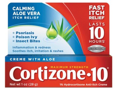 Stop the itchsanity with Cortizone-10 Maximum Strength* Soothing Aloe Itch Relief Cream. Formulated with 1% hydrocortisone, this anti-itch cream starts working fast to relieve itch associated with minor skin irritations, inflammation, and rashes due to eczema, psoriasis, insect bites, seborrheic dermatitis, poison ivy, oak, sumac, detergents, jewelry, cosmetics and soap. Cortizone-10 Soothing Aloe Itch Relief Cream is enriched with aloe that helps soothe skin and uses a fragrance-free and dye-free formula. It's the perfect addition to first aid kits, camping gear and travel essentials, so itching from pesky mosquito bites doesn't ruin your time outdoors. No wonder it's the No. 1 doctor-recommended OTC anti-itch brand**.