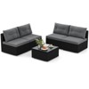 Elevate your outdoor living with our amazing 5-piece patio PE rattan furniture set! This outdoor conversation set features thick cushions with soft padded sponges, ensuring an incredibly comfortable sitting experience. The accompanying tempered glass coffee table provides an ideal space for items to be conveniently within reach. And that's not all! Plus, all pieces are crafted from fade-resistant and sun-protective PE rattan, designed for long-lasting use and durability. Besides, the modular design allows you to customize your outdoor space to fit your needs and style!