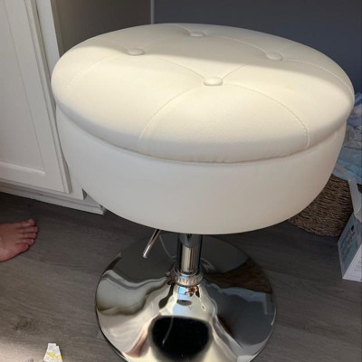 I love this swivel stool as a make up vanity stool. My other options were so short I could not see into the mirror! This one is adjustable. It also has great little storage area inside seat for miscellaneous bath items, etc. It not only looks great but it's sturdy and rolls over to the bath tub as a multi purpose faux wood table ! It has this amazing flip top seat that transforms into a sturdy table top to set a book, glass of wine, phone, candle etc while soaking in my tub . I just love it . Took me 5 years to find it. Comes in different faux leather easy to clean seat covers and clean looking stainless steel base !
