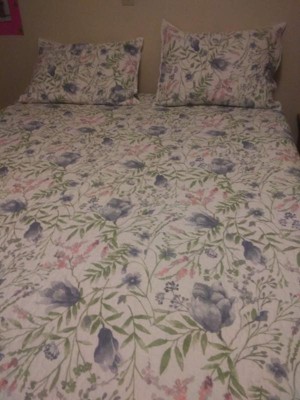 [This review was collected as part of a promotion.] My review is on the Cottage Classics Field Floral 3 Piece Full/Queen Comforter Set. It came with a full/queen comforter, and two standard shams. It fits my bed really well and adds a little bit of color and spring to my bedroom. It makes my room look allot larger than the dark blue colors that I had it there before. The comforter is made of 100% Cotton shell and 100% polyester filling. The shams are made of 100% Cotton, and they are all machine washable. I would recommend this comforter to anyone who wants a nice machine washable cover for your bed.