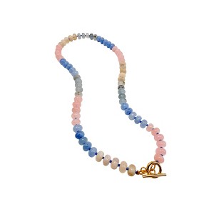 - Stone: 8mm rondelle beads: muliticolored quartz Length: 18" Clasp: Gold-plated stainless steel toggle clasp (waterproof, tarnish-resistant, and can be worn front or backwith or without a charm) Fit: Sits just at or below the collarbone; perfect for layering