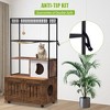All-In-One Cat Solution: A hidden litter box cabinet combines with a multi-level play area, featuring a cozy cat bed, sisal hammock, scratching mat, and sisal ball. Perfect for multi-cat households, this space allows for active cats to play while keeping the space tidy.Sturdy & Durable Construction:Reinforced metal frame ensures stability, while the waterproof and scratch-resistant wooden surface is easy to clean. Supports large cats and blends seamlessly with home decor.Smart Space-Saving Design: Conceals the litter box for odor control and privacy, while the built-in storage shelf keeps supplies organized. Switchable side panels allow flexible corner placement.Cat-Friendly Features: Designed for natural feline behavior, offering a secluded litter area, elevated seating area, and interactive toys (hammock, sisal ball, and scratching mat) to satisfy the instinct to play and scratch.Easy Assembly & Pet-Safe :Includes clear instructions and all necessary hardware for quick setup.
