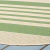 Introducing the essence of modern design combined with the versatility of indoor/outdoor living, our 7'-10" X 7'-10" Round area rug in a chic GREEN/BEIGE color palette brings a refreshing touch to any space. Designed with a contemporary round shape and a comfortable pile height of 1/4", this power-loomed rug showcases sharp lines and bold stripes that create a dynamic and eye-catching pattern.