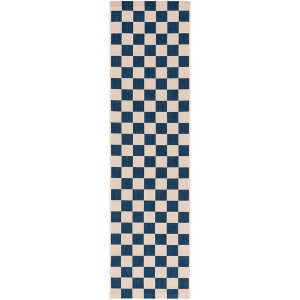 Elevate your space with this contemporary navy and beige runner rug, measuring 2 feet 3 inches by 8 feet. Crafted in Turkey, its power loomed design features a checkered pattern that brings a modern touch to any hallway or entryway. With a thickness of just 1/4 inch, this rug adds style without bulk. Made from 88 percent polypropylene and 12 percent polyester, it combines durability with visual appeal. Transform your home decor with this stunning piece that marries form and function seamlessly.