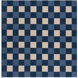 Embrace the minimalist charm with this square area rug, introducing a seamless blend of Navy and Beige. Boasting a versatile size of 2 feet 7 inches by 2 feet 7 inches, this rug adds a touch of sophisticated comfort to any indoor or outdoor space. It features a sleek 1/4 inch height, adding just enough plush underfoot without overwhelming your decor scheme.