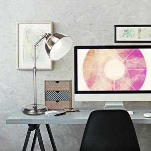 This is a nice looking lamp. I wish the on/off button for this lamp was not on the cord. I also wish the lamp extended up a little higher. I was glad that I could replace the bulb on this lamp unlike some other lamps. I want to swing this lamp away from my bed on my nightstand with one hand, when not needing a bright light, but it is awkward to do so. The base often moves when I try to redirect the light.