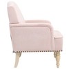 This accent armchair features a solid wooden frame and legs, offering exceptional sturdiness and durability, with a weight capacity of up to 300 pounds. The high-quality polyester fabric and high-density foam filling provide a comfortable, long-lasting seating experience. Its simple yet elegant design, complete with nailhead trim and retro wooden legs, enhances your home decor.
