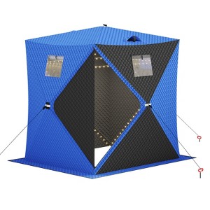 This specialized ice fishing tent features a windproof hub design that provides structural stability in harsh winter conditions. The spacious interior offers ample fishable area for multiple anglers while protecting against the elements. Easy to set up and durable, this shelter enhances your ice fishing experience with reliable comfort and functionality on frozen lakes.