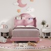 Create a dreamy bedroom for your child with this velvet upholstered princess bed frame featuring a storage bookcase headboard and soft LED lighting. The elegant wingback design adds charm and comfort, while the built-in shelves keep books, , and bedtime essentials neatly organized. Crafted with a sturdy metal frame and wooden slats, this platform bed ensures quiet, stable sleep with no box spring required. Perfect for boys or girls, it combines style, practicality, and easy assembly for a cozy, modern kids’ room.