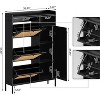 Transform your entryway with the COZONY Shoe Storage Cabinet, featuring an innovative design that combines three flip-down drawers with four adjustable shelves for maximum organization. This space-saving cabinet is crafted from premium engineered wood with natural rattan accents, offering both durability and elegant style that complements any home decor. The flip-down drawers provide concealed storage while the adjustable shelves accommodate various footwear styles from casual shoes to taller boots. Designed with anti-tip safety features and reinforced construction, this cabinet ensures stability and security for household use. The versatile design makes it perfect for entryways, hallways, or small apartments, providing ample storage without compromising on style. With its smart organization capabilities and modern aesthetic, this shoe cabinet keeps your space clutter-free while adding functional elegance to your home.