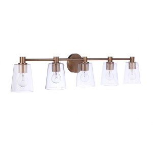 The Emilio Vanity Collection by Craftmade offers bright, clean lighting with transitional appeal and clear glass. Emilio is offered in five sizes and three finishes - brushed polished nickel, flat black and satin brass. Back Plate Height: 5.00 Back Plate Width: 5.00 Shade Included: Yes Material: Glass, Finish Color: Satin Brass, Width: 42", Height: 8", Length: 6.63", Depth: 6.6142", Backplate Width: 5", Backplate Length: 5", Lamping Type: Incandescent, Number Of Bulbs: 5, Wattage: 60 Watts, Dimmable: No, Moisture Rating: Damp Rated